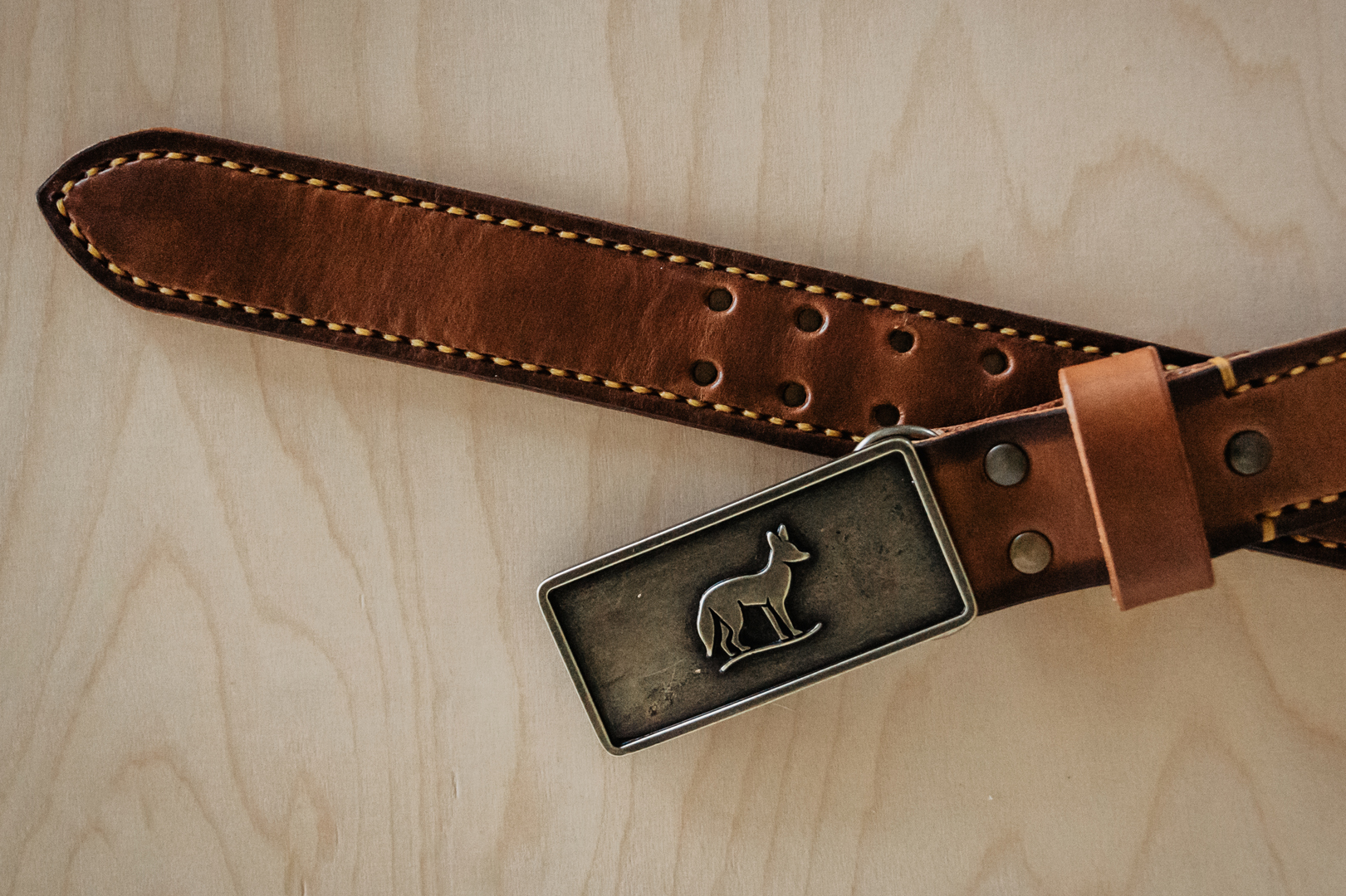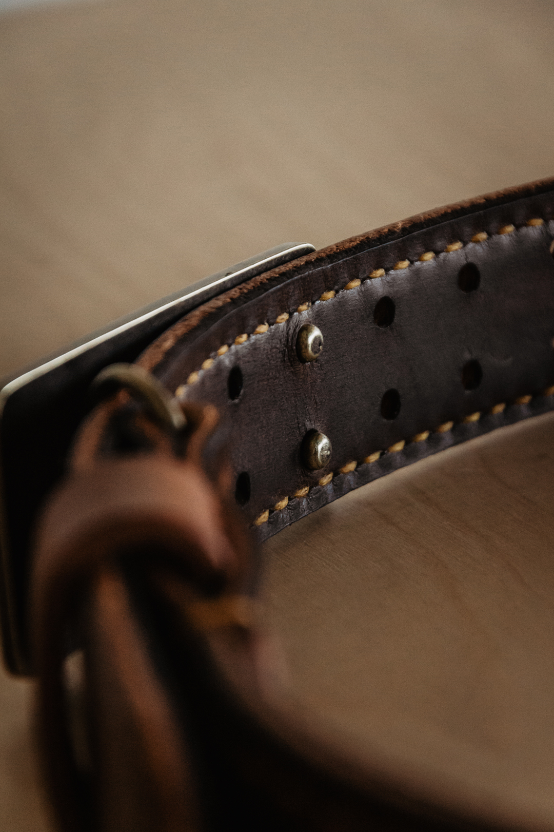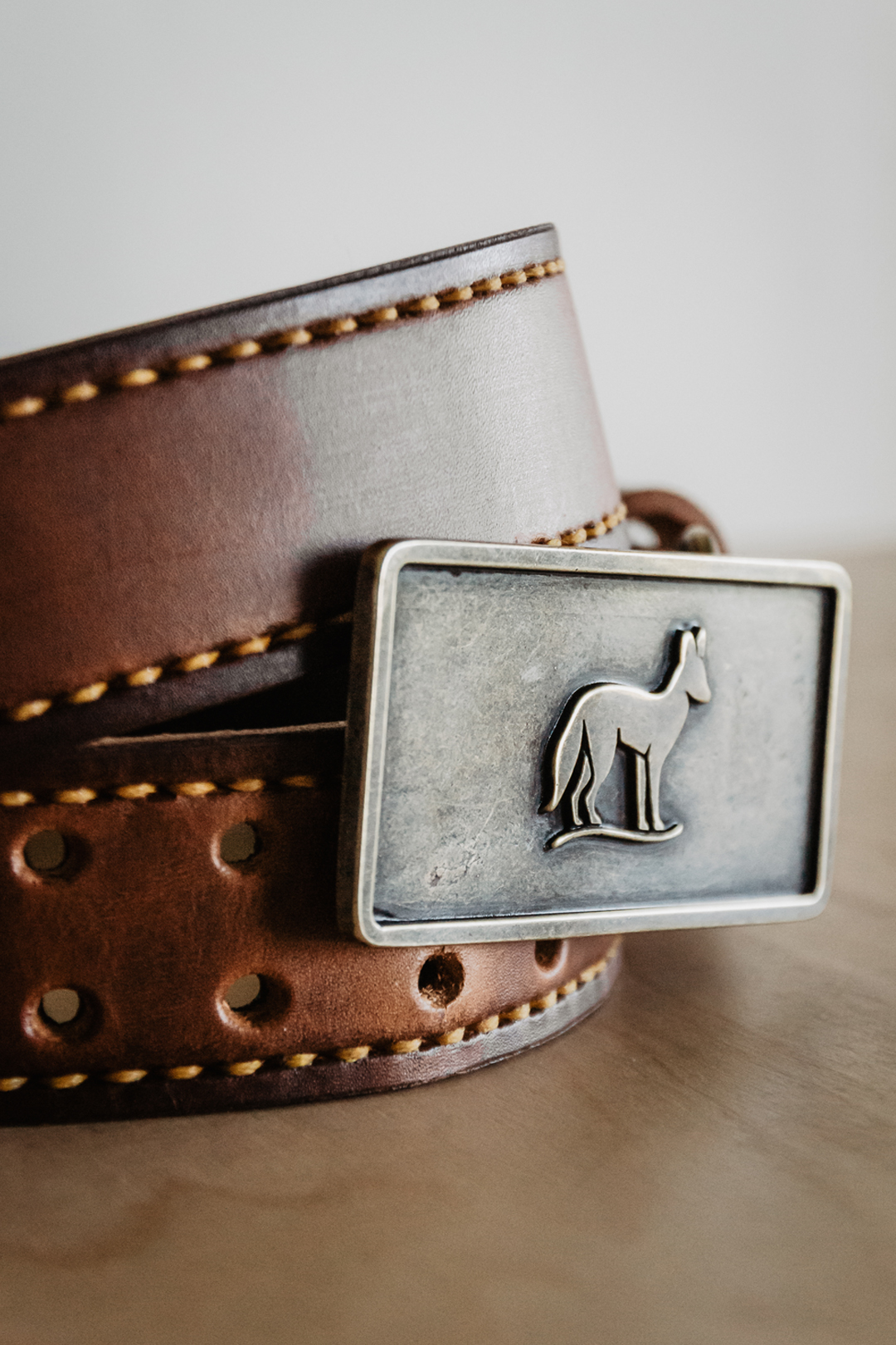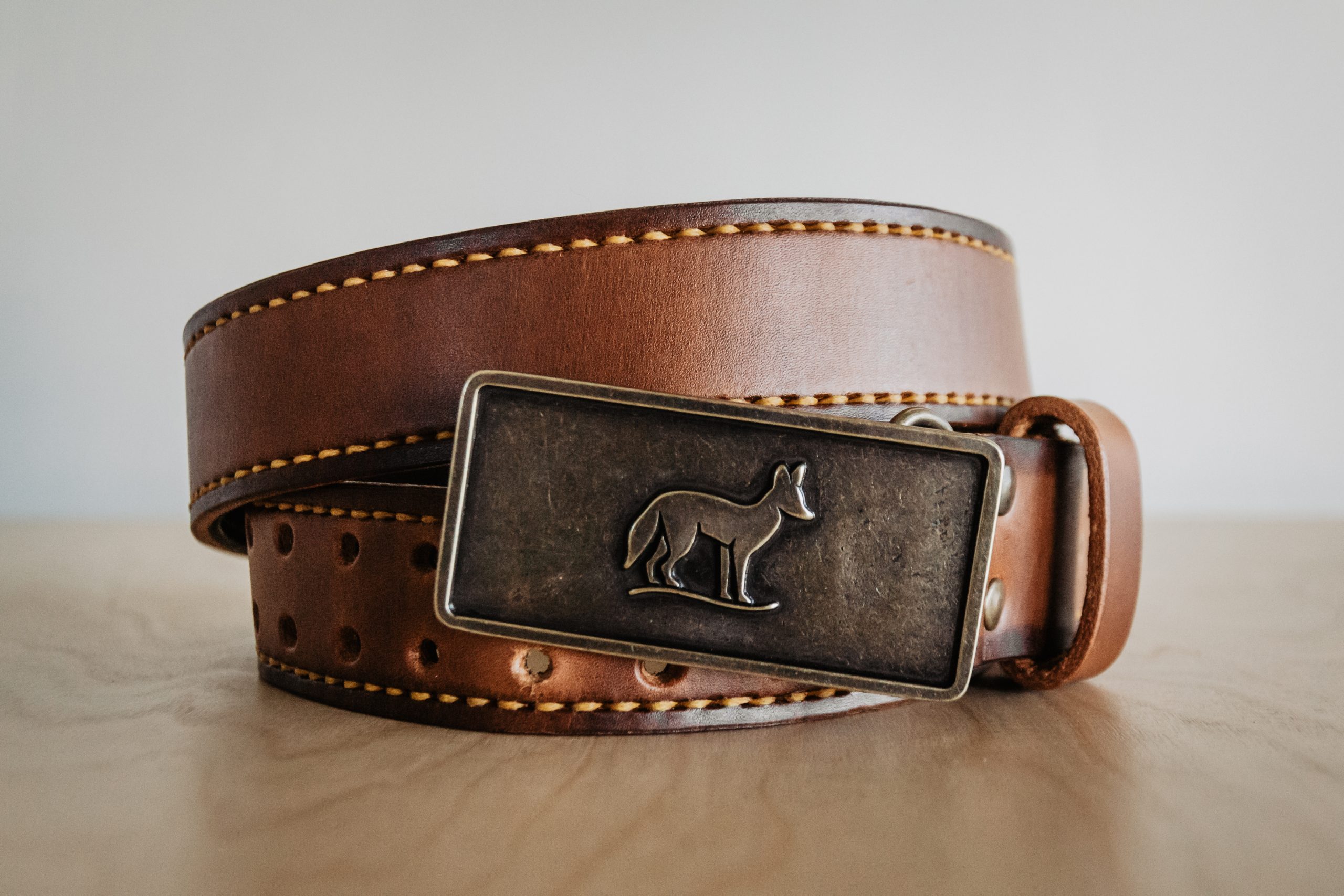 Double laired leather belt with hand stitching.